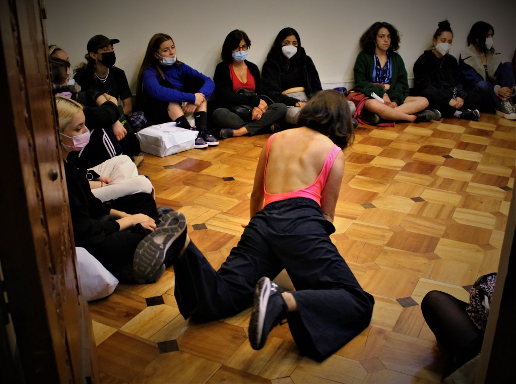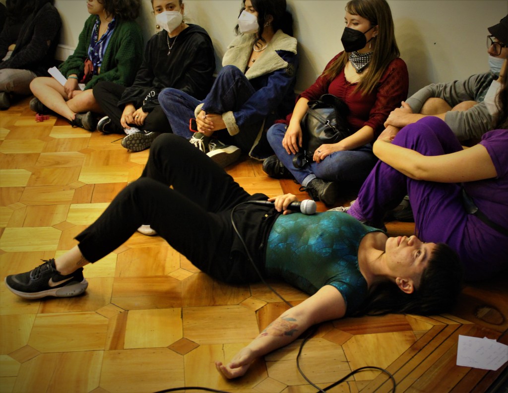<PLACER EN LAS DANZAS>, Es la escena que nos entregan las Sudakas Sudadas, para dar inicio a esta nueva expansión del proyecto, que además de generar un encuentro gozoso entre los cuerpos a través de movimiento, también se centra en una entrega masiva de libros El cuerpo es presente y una breve exposición de la historia del proyecto, sus antecedentes y una conversación con el público asistente.